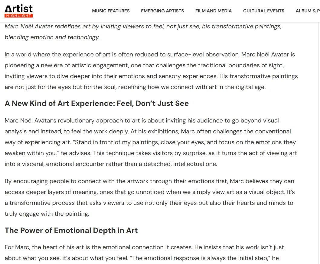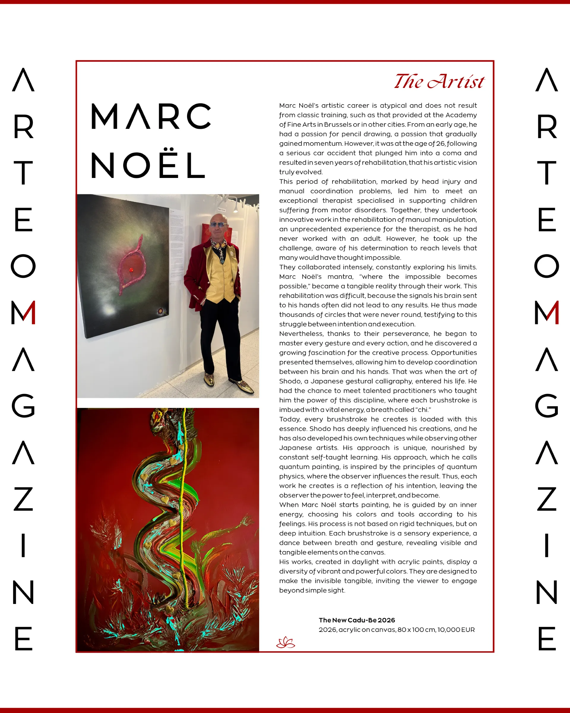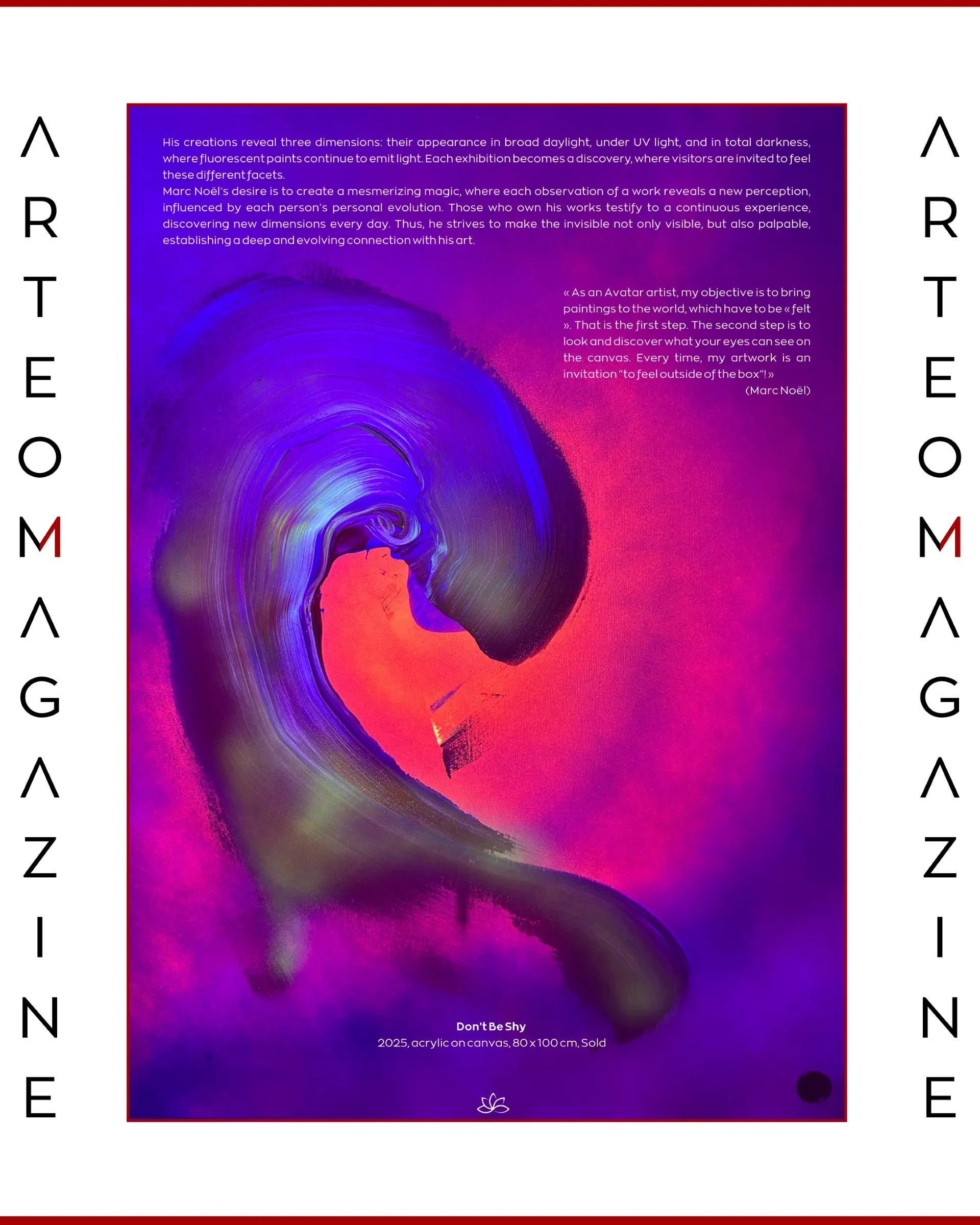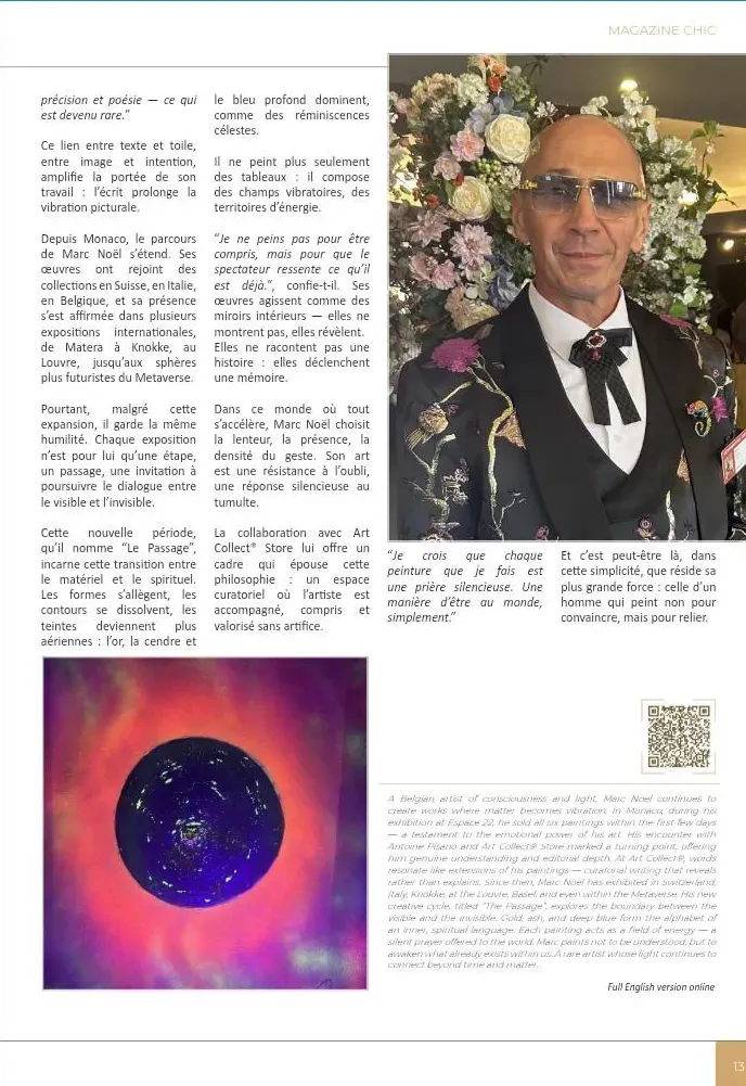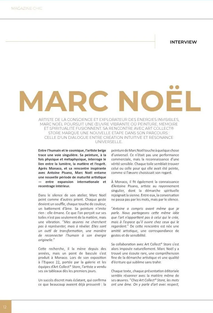 in this world from different viewpoints and in different forms but complementary to what the ego’s perception of reality is. In all his forms, and here in this biography more specifically as an artist painter, Marc Noël has the desire and the need to share with the world through his artistic creations something that is completely “out of the norm”, but where nevertheless the person who permits himself, and who dares to enter into the artistic creations presented by Marc Noël, will have the opportunity to discover another dimension.
